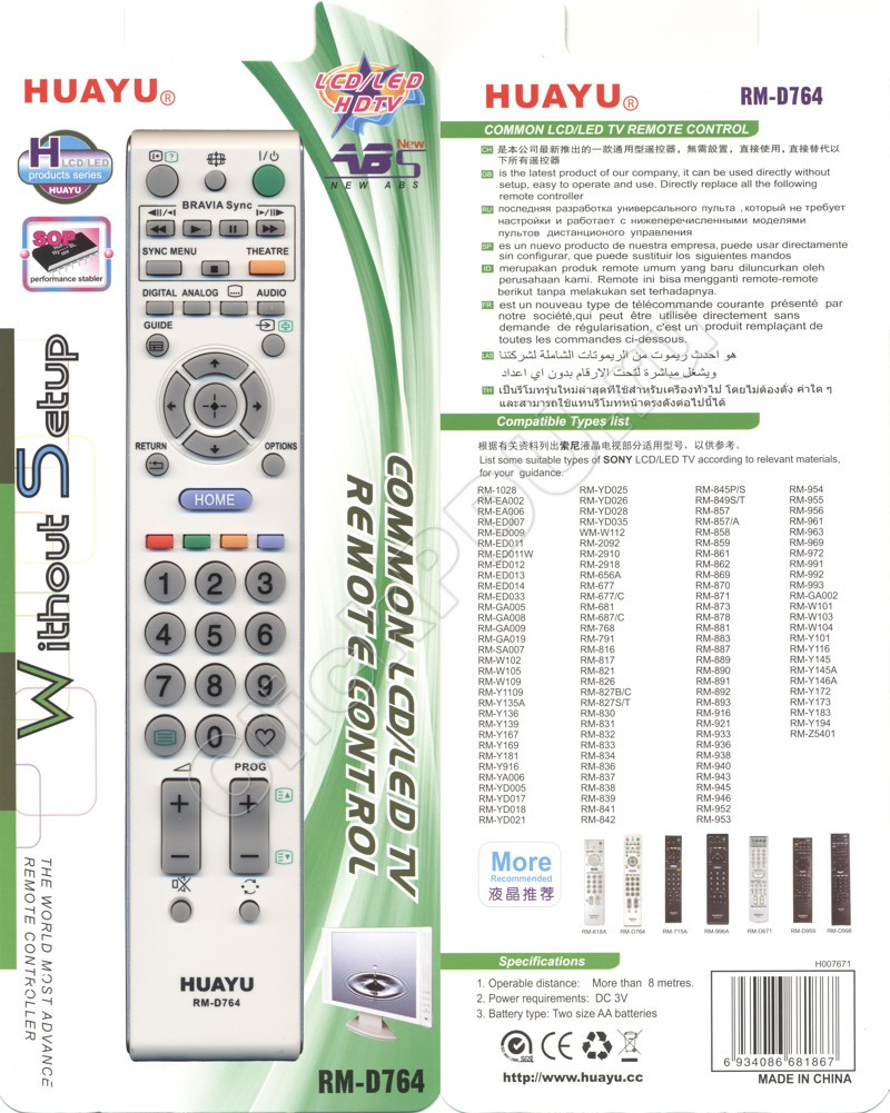 Пульт телевизионный Huayu для Sony RM-D764 WHITE