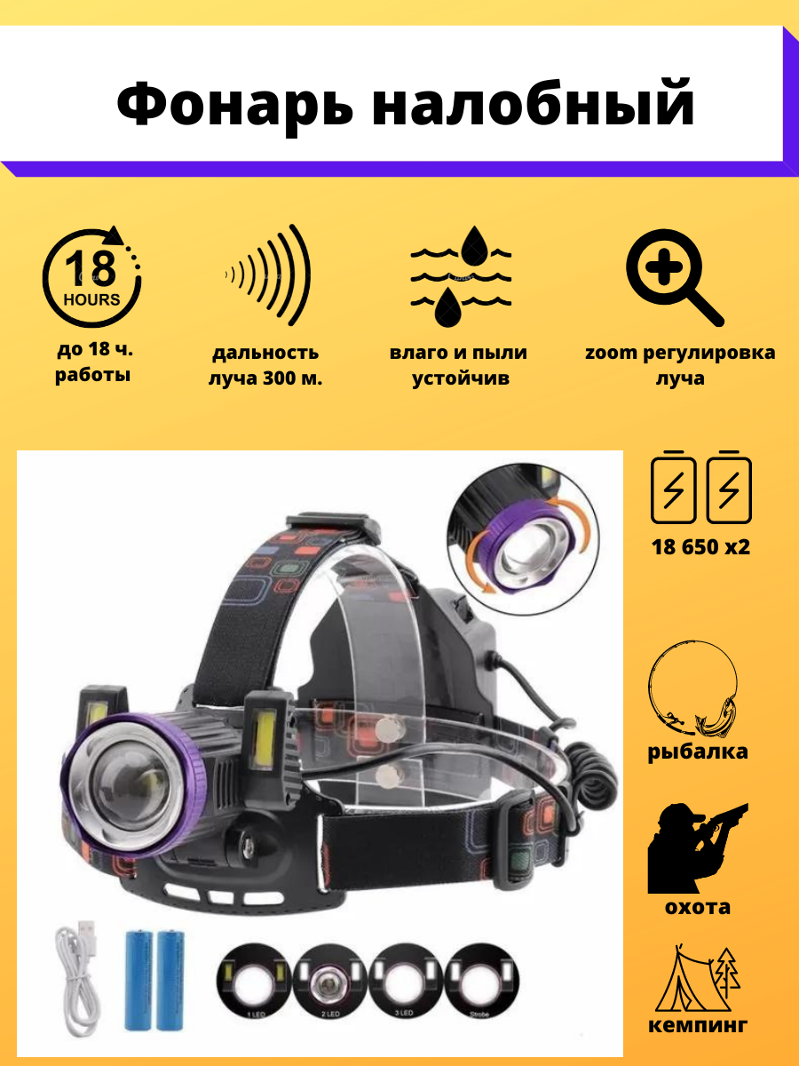 Туристический налобный фонарь XQ-167-T6+COB с одним диодом и дополнительной лентой для освещения в тумане,